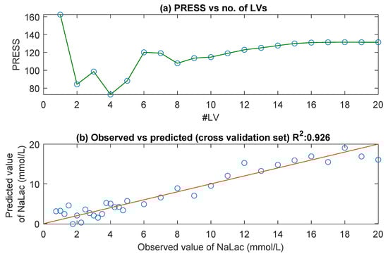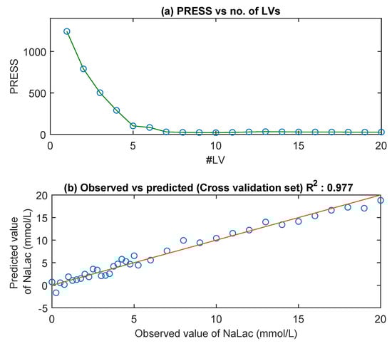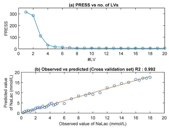 Following the determination of the predominant species in the spectra, PLS regression analysis was made on the preprocessed data. Before running the PLS routine, SG derivation was applied to all the spectra. The minimum number of LVs required for an accurate prediction of NaLac concentration was determined using the PRESS. This criterion helps avoid overfitting. Figure 5a shows the graph of predicted residual sum of squares vs. the number of latent variables for NIR data. From Figure 5a, it can be observed that after the 8th LV, it is unlikely that the addition of more LVs will significantly improve the PLS prediction. Therefore, eight LVs were used to build the PLS model. Figure 5b shows the reference vs. predicted NaLac concentration plot, where the predicted values are based on eight PLS factors. A diagonal line, as in the figure usually signifies a great match between the reference and predicted NaLac concentration. The high correlation between the predicted values and the reference values resulted in a coefficient of determination, R2, of 0.976 and RMSECV of 0.89 mmol/L.