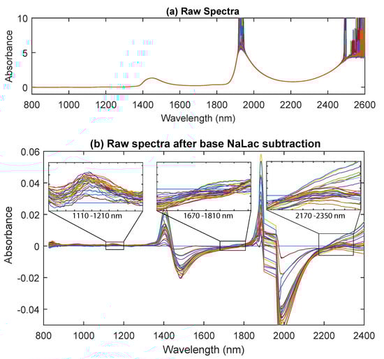 (a) The raw near-infrared (NIR) spectra of thirty-seven PBS samples and (b) the NIR spectra of samples after base lactate correction. Absorption peaks pertinent to NaLac can be seen in the regions between 1100 and 1210 nm, 1670 and 1810 nm, and 2170 and 23,500 nm.