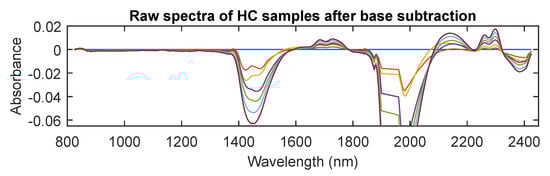 It is, however, essential to understand that these wide absorptions are caused by multiple narrow, overlapping absorptions. Therefore, to visibly see changes in other regions more relevant to lactate molecules, the baseline water absorption (NaLac = 0 mmol/L) was subtracted from the rest of the spectra. The high-frequency noise in the 1900–1960 nm and 2350–2600 nm regions was manually removed before zero NaLac spectral subtraction. This was to remove the noise which resulted from detector saturation (due to high absorption of water). Figure 3b shows the spectra of 37 NaLac samples following the base NaLac spectra subtraction. In Figure 3b, an absorption with a magnitude greater than zero theoretically reflects the NaLac absorption, while absorption with magnitude below zero represents water absorption. Although, this is not entirely true in this case due to the small concentration of NaLac (<20 mmol/L). Nevertheless, distinct peaks can now be observed in regions other than the water absorption peaks. These absorption peaks are between 2200 and 2350 nm (centering at 2259 and 2299), 1650 and 1800 nm (centering at 1684 and 1730), and 1200 and 1240 nm (centering at 1215). Absorption in these NIR regions is linked to the combination of C–H stretch with C–H bend (2200–2400 nm) and C-H stretching (1660–1780 nm is the 1st C-H overtone and 1100–1220 nm is the 2nd C-H overtone), respectively [,]. To validate the presence of detected peaks, raw spectra from a few high concentration samples were also acquired and is shown in Figure 4. The detected peaks are more distinctly visible in Figure 4 due to the high concentration of the samples, and the concentration of the sample corresponds linearly with the absorbance at the identified peaks [].