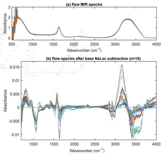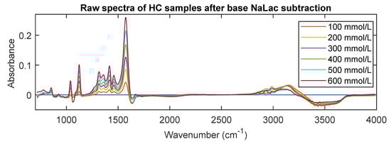 Figure 6b shows the same spectra after baseline (0 mmol/L) subtraction. The high-frequency noise peaks in the 500–700 cm−1 region were removed manually before the base spectral subtraction. This was to reduce the estimated errors in further analysis. As can be seen from Figure 6b, more bands relevant to the absorption of the NaLac in the solution are visible from the spectra in both the diagnostic region (1500–4000 cm−1) and the fingerprint regions (up to 1500 cm−1). By identifying the peaks in spectra and matching the frequency with the chemical groups that absorb in MIR region, functional groups were assigned to the corresponding vibrational peaks [].