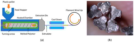 (a) Scheme of the extrusion system: screw velocity and velocity of the wind-up machine were optimized to find the best performance in terms of optical losses. In this case, the filaments were air-cooled, since poly (methyl methacrylate) (PMMA) is water absorbent. (b) Photo of the cross-sections of the obtained plastic optical fibers.