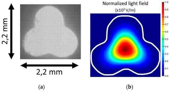 The transversal section of the three-lobe fiber was captured with an optical microscope (The Imaging Source Europe GmbH, Bremen, Germany) (Figure 2a), processed, and then imported into Lumerical MODE software. Mode simulations were performed to calculate the light field distribution of the lowest order modes in both the straight and bent fiber. Figure 2b shows the light field intensity of the lowest order fiber mode simulated in the straight fiber.