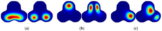 Light field intensity at 645 nm of the two lowest order modes calculated in the imported three-lobe structure cross-section for bending with curvature center placed: (a) on the upper surface of the fiber; (b) on the lower surface of the fiber; (c) on the right-hand surface of the fiber.