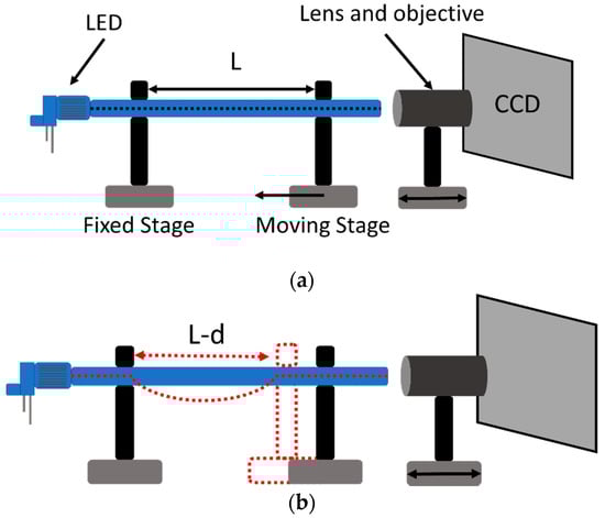 In this case, we need to use a two-dimensional light sensor, because the light intensity distribution has to be monitored—and not only the intensity, as is usual for intensity-based sensors. A sample of 20 cm was fixed between the two holders and a curvature with a ray of approximately 1 m was applied (Figure 4b). The constant curvature was obtained using a moving stage, and the curvature was approximated using the formula []: