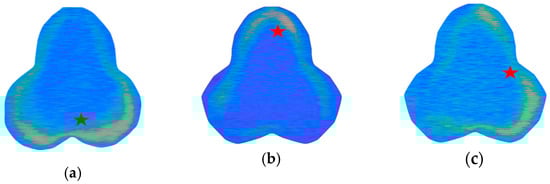 Images collected with the charge coupled device (CCD) camera after bending the three-lobe plastic fiber. Red stars indicate the position of the weighted centroid found from the converted gray-scale image. The curvature center placed: (a) on the upper surface of the fiber; (b) on the lower surface of the fiber; (c) on the right-hand surface of the fiber.