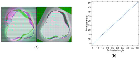 (a) Reference and rotated image superimposed before and after the registration algorithm is applied. (b) Comparison between the retrieved angles using the registration algorithm and the rotation angles applied. The error bars show the average error for ten measurements.