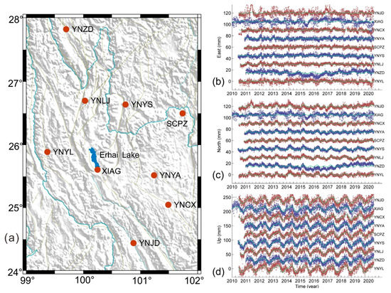 Recent studies have shown good consistency between seasonal variations in cGPS vertical time series and those modeled with water storage variations derived from the Gravity Recovery and Climate Experiment (GRACE) datasets [24,27,28,29]. Although these studies have provided a better understanding of these highly temporal cGPS time series correlated with CME filtering [19,27,28,29], their inferences on the consistency between cGPS time series and hydrological mass loading are based on monthly GRACE measurements. For example, Sheng et al. [27] found that, at a monthly time scale, the hydrological loading deformation accounts for a major percentage for the CME of cGPS vertical time series, nevertheless, the time span of measurements for 12 stations was no more than 2 years. Hao et al. [28] used the annual and semiannual sine function modeled from monthly GRACE data to remove the atmospheric and hydrological seasonal loading in daily cGPS measurements. In fact, more evidence has suggested that the annual signals in cGPS time series are a response to variations in the Earth’s surface mass loading [6,24,29], including changes of non-tidal atmospheric pressure, ocean loading, and hydrological water storage. Furthermore, in these previous studies, the time series of the vertical component were occupied to obtain the CME without ignoring any weakly correlated time series. Taking XIAG (Figure 1a) as an example, XIAG station is located on the south bank of Erhai Lake, which is the second largest reservoir in Yunnan province; the water level fluctuates annually with an amplitude about 3 m and has resulted in significant anomalies in gravity measurements [30]. Such loading effects associated with large local hydrological water storage may further result in significant responses in cGPS measurements [27]. Nevertheless, both the monthly time interval and ~400 km spatial resolution of GRACE data are too low to discern these local effects or the detailed changes in daily GPS measurements [24,27,28]. Therefore, it is necessary to quantitatively evaluate the impacts of local effects and loading deformation on the CME filtering for daily cGPS measurements.