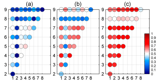 Correlation coefficients of (a) east, (b) north, and (c) up components for any two GPS stations. The numbers labeling the axis denote the stations listed in Table 1.