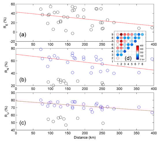 Figure 3 shows that the correlation coefficients decrease with the increasing inter-station distances. Although Figure 3a shows an overall negative linear trend, the variance is too large to be expressed as a linear trend. While after ignoring the low coefficients, both north and up components show linear trends with correlation coefficients decreasing with increasing distances. This confirms that the correlation coefficient becomes smaller when the sub-network is extended over larger areas.