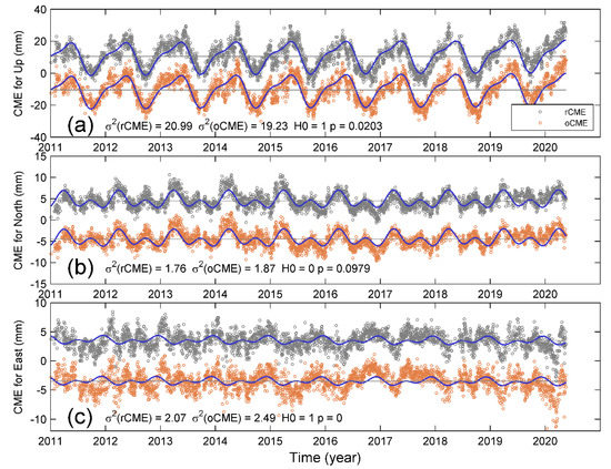 Figure 4a–c shows the oCMEs and rCMEs for three components, respectively. In order to display and distinguish between oCMEs and rCMEs more easily, we add an offset to each component; the offsets were ±3.5, ±4.5, and ±10.5 for east, north, and up components, respectively; also shown are the modeled annual and semi-annual variations in blue curves, which show that the vertical CMEs have the most remarkable seasonal variations, the north CMEs the second highest variation, while the east CMEs have minor seasonality. Such discrepancies further reflect the different inter-station correlations for the three-component displacement time series. Because of the similarities in both amplitude and phase for each component of oCMEs and rCMEs, it is not easy to distinguish between them by visual inspection. We computed the variances of postfit residuals after rCMEs and oCMEs filtering, i.e., and after removing a combination of linear trend and annual and semi-annual variations. Our calculations show that the east and up components are significantly different based on the F-test and p-values at the significant level of 5% (Figure 4a,c). Nevertheless, the postfit variances of rCME and oCME for the north component are statistically the same based on both F-test and p-value, with a value larger than 0.05 (Figure 4b).