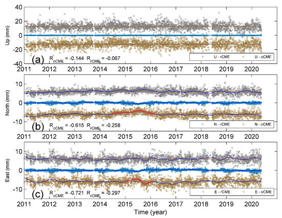 In this study, we chose seven sites that show high inter-station correlations to conduct CME filtering for a local network and discarded the other two sites to avoid any possible bias due to misleading weighting factors. Figure 6 and Table 2 show that the rCME filtering is much better than that of the oCMEs in which the low-correlated sites are included. Since XIAG is weakly correlated with all the other stations, we further examined if there are any abnormal signals when the residual time series of XIAG are involved. For each component, we estimated the non-linear trends (curves in blue) for the two corrected time series and the weighted residuals (blue circles) of XIAG, and then computed the correlation coefficients between the weighted time series of XIAG and these two corrections. Figure 6a shows a weak correlation in the up component. In comparison, Figure 6a,b show that the weighted residual time series of XIAG are negatively correlated with the oCME correction in both the east and north components with coefficients of −0.732 and −0.626, respectively, indicating a large percent of oCME correction is contributed from the weighted residual time series of these two components of XIAG. Furthermore, compared with the rCME correction, a transient-like signal is present in the oCME corrections during the period from summer 2014 to the beginning of 2016 in the north component (Figure 5b). During the time from 2015 to 2016, a similar spurious transient is present in the oCME-corrected east component (Figure 5c). Although transient deformation may be present due to the intense drought [10,24], spurious transients will lead to misunderstanding of the physical processes.
