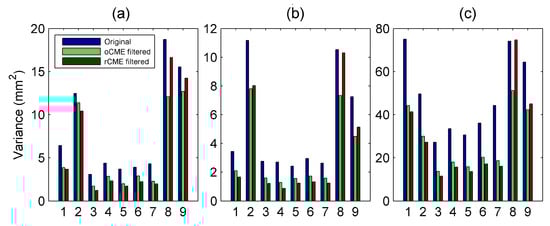 The variances of postfit residuals for (a) east, (b) north, and (c) up components. The bars in blue, green, and red denote variances of the postfit residuals for the original time series and the time series after oCME and rCME filtering, respectively. Except for XIAG and YNYL, most of the variances after rCME correction are less than those corrected with oCME for all three components. The numbers labeling the horizontal axis denote the stations listed in Table 1.