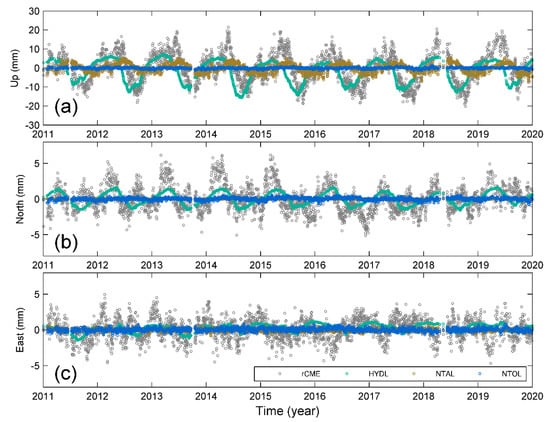 Figure 7 shows rCMEs (gray open circles) stacked from the highly correlated residual position time series; the annual amplitudes are 0.45 mm, 1.05 mm, and 8.70 mm for the east, north, and up components, respectively. The stacked displacements are loaded from HYDL, NTAL, and NTOL. In these three loading terms, the HYDL loadings have the largest annual amplitudes of 0.57 mm, 1.15 mm, and 7.28 mm for the east, north, and up components, respectively. In comparison, the effects due to the non-tidal atmosphere and ocean are minor, with the annual amplitudes of 2.61 mm and 0.23 mm in vertical displacements, respectively, while the annual amplitudes are less than 0.1 mm for both east and north components.