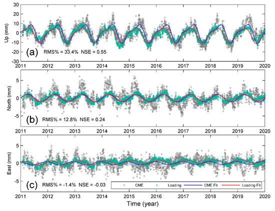We thus compared the rCMEs and combinations of these three loading terms. Figure 8 shows both rCMEs (gray open circles) and the combined loading deformation (green open circles) and the modeled annual and semi-annual variations for three components. As expected, the combined loading deformation in the up component has the most remarkable seasonal variations and agrees much better with the CME than before combination; the NSE increases from 0.28 to 0.55, and RMS reduction increases from 15.19% to 33.4% (Table 4). In contrast, the phase lag in the east component is too large to reach a good agreement between them, resulting in both a negative NSE and RMS reduction. For the north component, the increases in both NSE and RMS reduction are also minor.