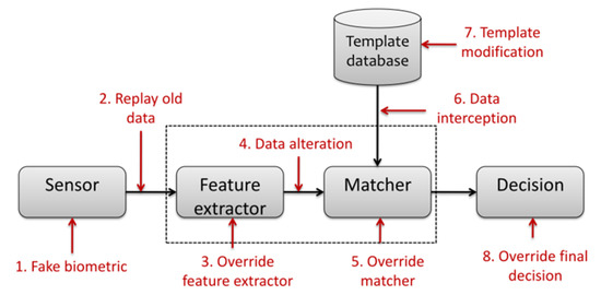 - Uludag, U.; Jain, A.K. Attacks on biometric systems: A case study in fingerprints. In Electronic Imaging 2004; International Society for Optics and Photonics: Bellingham, WA, USA, 2004; pp. 622–633. [Google Scholar]