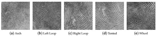 - Karu, K.; Jain, A.K. Fingerprint classification. Pattern Recognit. 1996, 29, 389–404. [Google Scholar] [CrossRef]