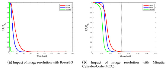 We can see, in both cases, the small advantage for an attacker to know the resolution of the original image extracted by the sensor. In order to analyze whether the resolution of the original image has an impact on the efficiency of this attack, we apply the following protocol: we only consider the scores between the reference and attack models with the same resolution images. In this case, we have three sets of matching scores. Thus, we can compute the evolution of the value for each image resolution, as shown in Figure 5.