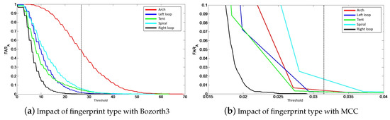 - Minutia Cylinder-Code (MCC) algorithm [15]: The EER value of this algorithm was also computed using the DB_SFinge database. The value obtained was equal to 0% for a decision threshold .