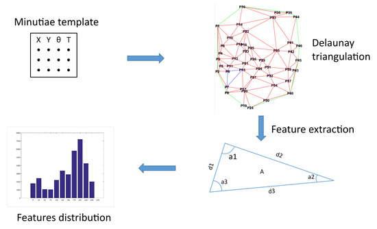 In order to take into account the spatial distribution of minutiae, we propose to use the Delaunay triangulation as translation and rotation invariant representation [27,28]. Delaunay triangulation is used in various domains, such as algorithmic geometry [29] to solve problems, or in surface reconstruction [30,31,32]. This representation has often been used for digital fingerprints [33,34,35]. This representation allows us to create a structure containing parameters describing each template, as shown in Figure 7. This structure is composed of many elements: length of the edges of the triangles, the angles, the area of the triangles and thei perimeter. Figure 8 shows an example of triangulation obtained by considering the minutiae as the vertices of the generated triangles. For each triangle, we extract (1) all the three angles values, (2) all the three edge lengths, and (3) the triangle area.