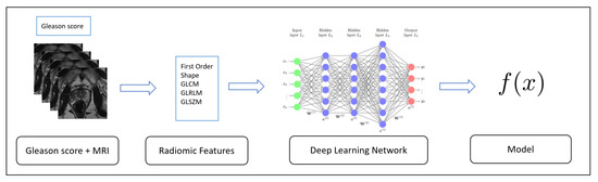 The radiomic feature categories are considered as inputs to the designed deep learning network aimed to discriminate between different Gleason score prostate cancers. Using the designed network we built a model able to abstract several types of prostate cancers. Once the model is built from the radiomic features directly gathered from MRIs, we evaluate the effectiveness of the proposed method in the Gleason score prostate cancer detection using MRIs not included in the data considered to generate the model.