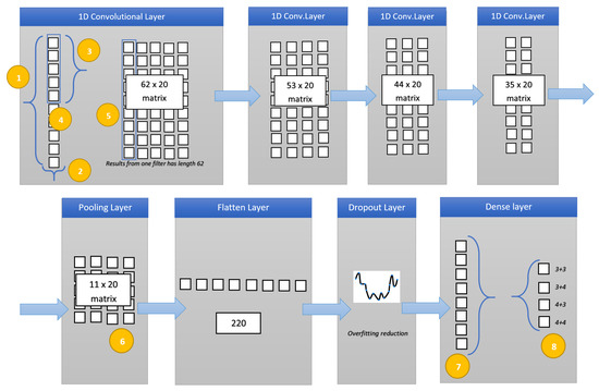- 1D Convolution Layer: the first 1D convolutional layer. The yellow point n. 3 identifies the kernel size i.e., the size/height of the sliding windows that convolves across the data. It is also referred to as kernel size or filter length. We set this parameter equal to 10. With a height of 71 and a kernel size of 10, the window will slide through the data for 62 steps (). The yellow point n. 4 identifies the filters i.e., how many sliding windows will run through the data. We set this parameter as 20, and in this way, 20 different features can be detected in this layer (also called feature detectors). This is the reason why this operation is results in a 62 × 20 output matrix: this initial layer will learn the basic features. The considered activation function is relu (also for the others considered convolutional layers of the network), because usually models with the relu activation function neurons converge much faster than neurons with other activation functions. Basically, the relu function gives an output x if x is positive and 0 otherwise (the choice of the activation function is a parameter chosen by the network designer);