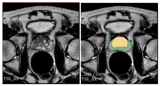 Two prostate cancer public data-sets freely available for research purposes (https://wiki.cancerimagingarchive.net/display/Public/PROSTATE-DIAGNOSIS, https://wiki.cancerimagingarchive.net/display/Public/Prostate+Fused) are considered to evaluate the effectiveness of the proposed method. The first one is composed of 824 slices belonging to 36 patients while the second one is composed of 676 slices belonging to 26 patients, acquired using a 1.5 T Philips Achieva. The datasets are composed of prostate cancer T2-weighted MRIs acquired using a 1.5 T Philips Achieva by combined surface and endorectal coil, including dynamic contrast-enhanced images obtained prior to, during and after I.V. administration of 0.1 mmol/kg bodyweight of Gadolinium-DTPA (pentetic acid). The data-sets were collected from different institutions: the first one is from the Boston Medical Center, Boston, Massachusetts, USA and the second one from the National Cancer Institute, Bethesda, Maryland, USA. The considered MRIs contain the segmentation (i.e., the ROI) provided by radiologists and doctors, pathology biopsy and excised gland tissue reports. Furthermore, there is also the MRI radiology report. We consider different datasets belonging to different institutions (with the ROIs marked by different radiologists) to train the model using a dataset and perform the evaluation using the second independent dataset, but also with the aim to minimize the impact of the ROI selection. Figure 4 shows an example of slices related to a 4 + 3 Gleason score: the left slices are without the ROI and the lesion is visible, the right one with the ROI. Considering that each prostate cancer grade is composed of two values i.e., the cancer grade of the main mass and the cancer grade of the second largest mass, and for each mass there is an ROI we combine these two ROIs to compute the radiomic features. As a matter of fact, in this paper the idea is to detect the prostate cancer grade and not only the grade of the main mass or to the second one, for this reason we resort to a combined ROI for radiomic feature extraction. Moreover, to evaluate the effectiveness of the proposed deep learning network we take into account an additional data-set composed of normal cases. The normal cases data-set is freely available for research purposes (https://i2cvb.github.io/#prostate-data) and contains 300 MRIs belonging to 10 different healthy patients (30 slices for patient) [18,19].