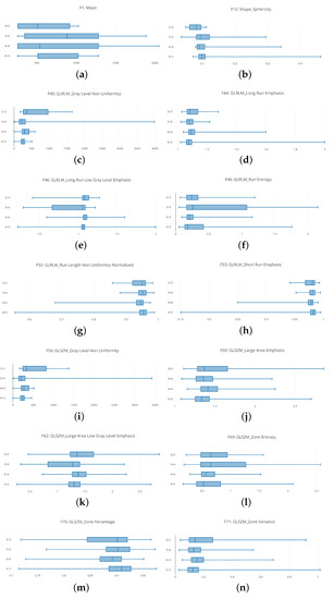 Descriptive Statistics: boxplots for a subset of the considered radiomic features (Mean (a), Shape Sphericity (b), Gray Level Non Uniformity (c), Long Run Emphasis (d), Long Run Low Gray Level Emphasis (e), Run Entropy (f), Run Length Non Uniformity Normalized (g), Large Area Emphasis (h), Gray Level Non Uniformity (i), Large Area Emphasis (j), Large Area Low Gray Level Emphasis (k), Zone Entropy (l), Zone Percentage (m), Zone Variance (n)).