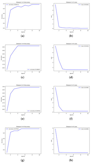 Plots in Figure 6e,f are related to the performances obtained for the Gleason 4 + 3 prediction. The deep neural network obtains an accuracy equal to 0.98780 and a loss equal to 0.20396 on the 10 epochs. The deep neural network employs three epochs to reach the best tuning.