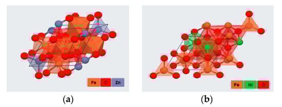 (a) Normal structure: ZnFe2O4; (b) Inverse structure: NiFe2O4. The atoms are represented by spheres: Fe (orange), O (red), Zn (purple) and Ni (green).