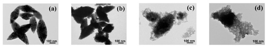 TEM images of the sample synthesized with different mole ratios of ZnO to FeCl3: (a) 1:0, (b) 6:1, (c) 3:1 and (d) 1:1 [18].