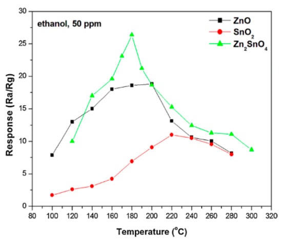 Response of the calcined ZnO, SnO2, and Zn2SnO4-based sensors to 50 ppm ethanol gas at different working temperatures [19].
