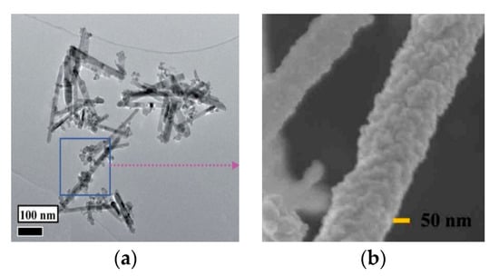 The guide agent, a key element of the soft template method, is very widespread in the synthesis process of spinel morphology. Wang et al. [22] used FeSO4·7H2O and Zn(NO3)2·H2O as reaction raw materials, with cetyltrimethylammonium bromide (CTAB) as the directing agent. After usual steps, the final morphology of the ZnFe2O4/ZnO, which is shown in Figure 5a presented with a diameter of 9.4–34.7 nm and a length of 140–410 nm porous rod-like structures. The plausible mechanism of the rod-like structures is explained as the assistant of cation CTAB surfactants that be further explained as follows: under water bath conditions CTAB can help Zn(OH)42− combine with each other and decompose into ZnO nuclei which can self-assemble and grow into a rod-shaped structure in a specific axis orientation. Due to the unique structure formed by the surfactant and the role of the heterojunction, the ZnFe2O4/ZnO nano heterostructure had excellent gas sensitivities. Specifically, compared with the zinc oxide nanowire synthesized by Zou et al. [23], the heterojunction nanowire structure synthesized in this experiment can reach a gas response of 26.5 at a lower working temperature and a reaction time of 12 s, while the corresponding zinc oxide can only achieve a response of 9.1 to n-butanol at 320 °C. Wang et al. [24] had also done experiment using organic structure-directing agents to form rod-like structures. During the experiment, the researchers used SDSN as a directing agent, so that the material eventually formed a SnO2/ZnO nanowire structure shown in Figure 5b.