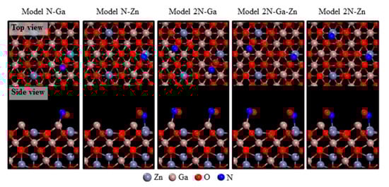 Atomistic representations of detailed N-Ga and/or N-Zn bonding arrangements pertaining to NO exposure on Ga-Zn-O-terminated ZGO (111) models. The atoms are represented by spheres: Zn (gray), Ga (brown), O (red), and N (blue) [27].