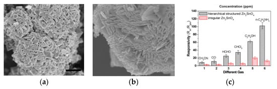 Jiang et al. [29] used raw materials and methods that are similar to the above-mentioned and synthesized a cubic nanostructure assembled from nanoplates without the calcination process. In the article, comparing the ordinary Zn2SnO4 with the assembled cubic structure, it can be found that the cubic structure significantly improved correspondingly through the response curve in Figure 7c. Although the specific surface area of the assembled cubic structure (26.99 m2/g) is smaller than that of the irregular Zn2SnO4 nanosheet structure (40.49 m2/g), the corresponding effect of the cubic structure is better. The result contrary to logic can be explained as the aggregation of gas molecules will not only affect the occurrence of high response, but also affect the response speed of the gas [30]. As a layered structure, the cube-like morphology has a clear porous structure, and the surface can have better accessibility than the sheet structure. At the same time, it can avoid particle consolidation and provide an effective path for the diffusion of the target gas. In addition, the obvious appearance of a (1 1 1) crystal plane may also provide active sites for gas adsorption, increasing the gas response of the overall material. More articles studied the combination of nanostructures forming into a bulk structure are listed in Table 1.