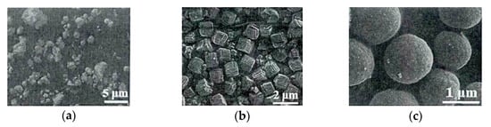 SEM images under different reaction conditions (a) Molar ratio of ethanol to EG = 1:1 and 180 °C for 4 h; (b) EG alone and 180 °C for 10 h; (c) Molar ratio of ethanol to EG = 1:1 and 180 °C for 10 h. [38].