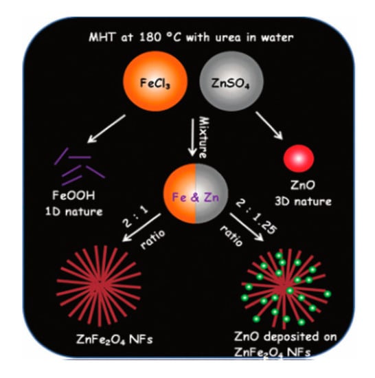 Sahoo et al. [40] used the modified hydrothermal (MHT) to achieve the synthesis of two type flower-like structures by choosing different synthesis strategies. The MHT under the action of urea made the reaction process reactant Fe(OH)3 dehydrogenated into (FeOOH). After adjusting the molar ratio of Zn to Fe, two different forms of nanoflowers were finally generated, and detailed processes are clearly shown in Figure 9. In addition, Sahoo also mentioned the application of ZnFe2O4 nanoflowers in other fields like mimicing peroxidase activity in this paper. This experimental result showed that ZnFe2O4 was helpful for the selective detection of H2O2 and Hg2+ ions in the solution by the naked eye as well.