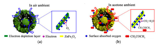 Schematic diagram of possible reasons why ZnFe2O4 core-shell microspheres exhibit higher acetone response (a) contact with air; (b) contact with the aimed gas [47].