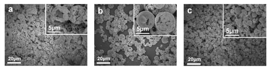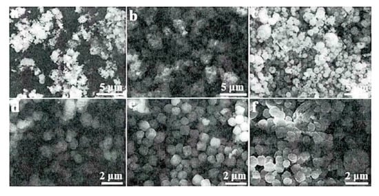 It is worth noting that grinding also influences morphology. In the experiment, Yang [61] conducted a grinding operation on the synthetic product. From the comparison of the SEM images before and after, it can be found that the grinding destroyed the original spherical structure, and the material has agglomerated. Therefore, in the experiment, the grinding operation should be carried out selectively to keep the most rational appearance.