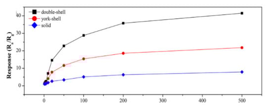 Qu et al. [59] synthesized ZnFe2O4 with double shell structure using 0.25 mmol zinc nitrate and 0.5 mmol ferric nitrate as raw materials, and a mixed solvent of glycerol and isopropanol as reaction environment. In the annealing process, three products with different morphologies were formed by controlling various heating rate upon 1 °C/min, 20 °C/min to directly 350 °C. From Figure 13, it can be found that as the heating rate is gradually accelerated, the morphology gradually changed from a solid ball to a double-shell structure. Observing the response of the three structures to acetone in Figure 14, it was seen that the increase in the number of shells had a good improvement in the response property of the gas. The impact on sensing properties are due to the porous surface of the double-shell structure, which can provide more active sites, adsorbing more oxygen without preventing gas diffusion.