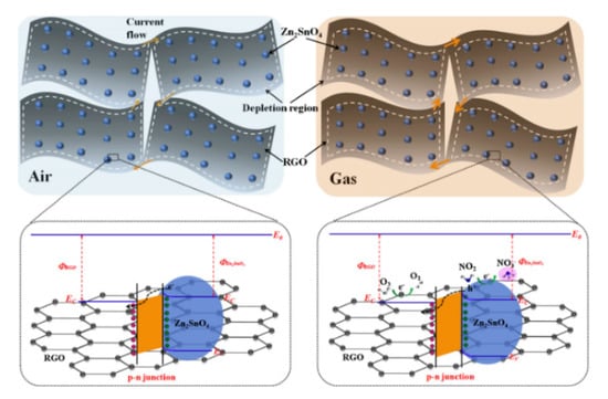 The representative models of Zn2SnO4-RGO hybrids: schematic illustration of the energy band structures and the form of p-n heterojunction in air and oxidizing gases [64].