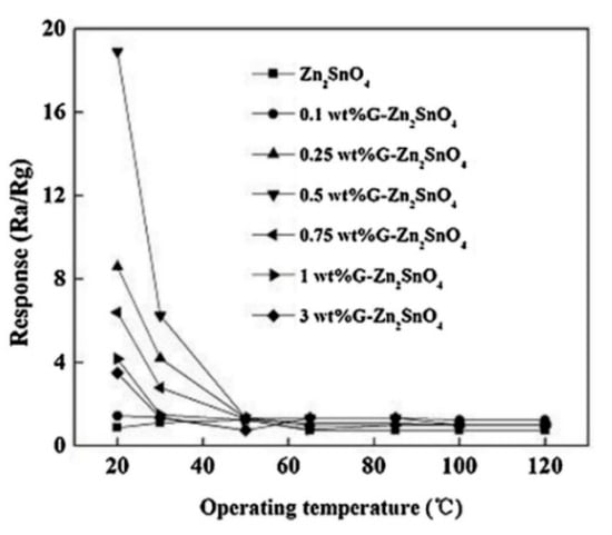 The responses to 1000 ppm formaldehyde vapor of graphene-Zn2SnO4 with different graphene content (0.0, 0.1, 0.25, 0.5, 0.75, 1, and 3 wt%) prepared at 200 °C [72].