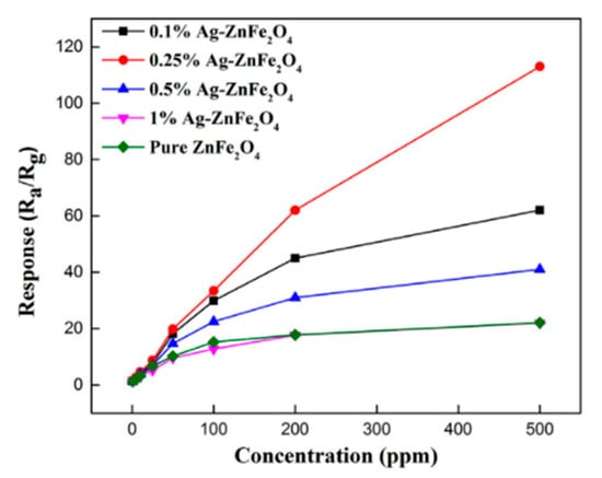 In this section, a typical n-type semiconductor ZnFe2O4 will be analyzed to clarify the agreed-upon working mechanism of a chemical gas sensor. According to habit, the change of the resistance, usually written as Ra/Rg (Ra: the resistance in the air; Rg: the resistance of the sensor after exposing to the aimed gas), is the response which is the main performance of a gas sensor.