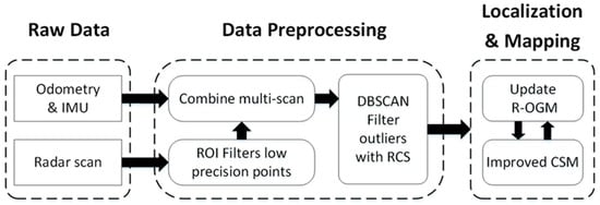 In this paper, a millimeter-wave radar SLAM assisted based on RCS and IMU assistance was proposed, which includes radar data preprocessing and tightly coupled localization and mapping. In each parts of the proposed method, the assistance of RCS target was used. In data preprocessing, this paper selected ROI to filter out low-precision points and used DBSCAN to filter outlier points. When DBSCAN filtered outliers, this paper used the three-dimensional features of radar data: The Cartesian position of the target and RCS. This paper also used the Mahalanobis distance to measure the similarity of the radar data, which realized the adaptive determination method of DBSCAN parameters. In localization and mapping, this paper proposed an improved CSM method. This was a “Scan to Map” point cloud matching method, which achieved the tight coupling of localization and mapping. When constructing the map, this paper used the RCS target, and the constructed map was called R-OGM. In this paper, three improved CSM methods combining RCS target were proposed, and the effectiveness of the third method was verified.