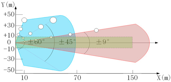 In recent years, vehicle-mounted millimeter-wave radars have become more and more popular due to their low cost and good robustness [44]. They usually give the measurement information of the detected targets directly. The original radar echo data contains targets in the form of point cloud, which is helpful for later processing. The vehicle-mounted millimeter-wave radar used in this paper can measure the position, speed, and RCS of the target. The radar detects n targets in each frame, and the measured value Zm of the m-th target contains multidimensional features, as follows: