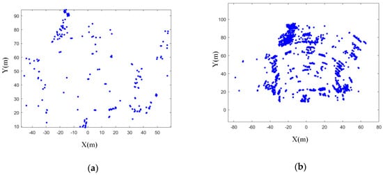 Point cloud of radar. (a) Single frame scanning point cloud of radar; (b) “Multi-scan” with N = 20.