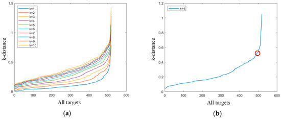 First, the three-dimensional vector Xm of each target was constructed, such as in Formula (4), and the Mahalanobis distance between vectors was calculated. Then, the Mahalanobis distance between each target and all other targets was counted, and the Mahalanobis distance between each target and the k-nearest target was counted, respectively, which is called the “k-distance” in this paper. We recorded the k-distance of all targets, and drew the k-distance diagram in descending order. In this paper, the k-distance diagram with different K values were drawn, as shown in Figure 5a. At this time, we observed the k-distance figure, and a good value of e was the position of the “elbow” shown in the figure [6], as shown in Figure 5b. Here, K = 4 was taken as an example.