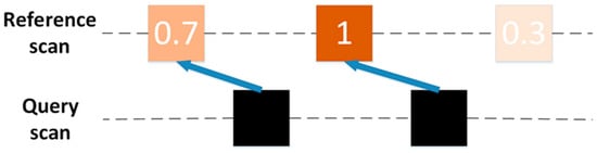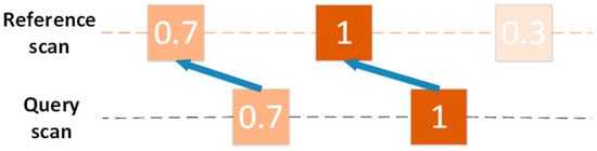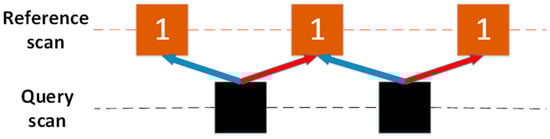 The original CSM is a “scan to scan” point cloud matching method, which only matches Q and F of two adjacent frames. However, for the following two reasons, the original CSM is not suitable for the millimeter-wave radar. The first reason is that the data volume of millimeter-wave radar is very small and sparse. Even if the “Multi-scan” has been constructed in the preprocessing process, it still cannot estimate the radar pose well when matching. The second reason is that the original CSM method gives the same occupancy probability to each point in the reference scan F when constructing the rasterization lookup table. For the millimeter-wave radar with low data precision, it leads to poor results of point cloud matching. As shown in Figure 6, the orange square represents the reference scan F and the black square represents the query scan Q. The numbers in the orange square are the occupancy probabilities assigned to the point cloud by the Gaussian distribution, and they are all equal to 1. Using the original CSM, we obtain two matching relationships, as shown by the blue arrow and the red arrow in the figure. Both of these situations may happen, because the scores of the two situations are equal, so the radar pose cannot be estimated correctly. To solve this problem, this paper introduced the RCS feature of the millimeter-wave radar point cloud to further restrict the point cloud matching relationship.