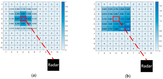 - When constructing the rasterized lookup table, we no longer assigned the same occupation probability to each point in F but assigned a different probability value to each point in F according to the RCS of the target.