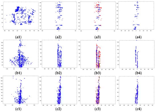The three groups of pictures (a–c) correspond to three scenes. (a1–c1) A point cloud map combining 20 frames of original data; (a2–c2) A point cloud map after filtering out low-precision points; (a3–c3) An effect map of DBSCAN identifying outliers, in which the red points are outliers; (a4–c4) Point cloud after filtering out outliers. The vertical direction is the y-axis, and the horizontal direction is the x-axis.