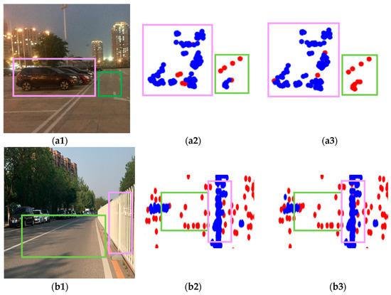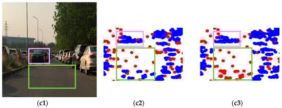 Then, we compared the recognition results of outliers using RCS features and DBSCAN without RCS features, as shown in Figure 12. The figure included the processing results of three groups of data, a, b, and c, corresponding to three scenes, respectively. a1–c1 were partial images of the real scene. a2–c2 were the partial results of outlier recognition without RCS features. a3–c3 were the partial results of outlier recognition using RCS features. The e and MinPts parameters of the two methods were determined using the method proposed in this paper. In the three pictures of each scene, the pink frame and the green frame corresponded one to one. For the pink box, we can observe that there were three cars in a1, a row of guardrails in b1, and one car in c1. Both a2–c2 and a3–c3 could retain the main point cloud of these targets, and there was almost no difference between the results of using RCS features and not using RCS features. Regarding the green frame, the green frames in the three scenes were all open spaces, and the point clouds in this area were all outliers. Observing b2 and b3, the point clouds in the green box were all identified as outliers, which was consistent with the actual situation. However, in a2 and c2, some of the point clouds in the green boxes were not recognized as outliers, while the point clouds in the green boxes in a3 and c3 were all recognized as outliers. The reason for the poor recognition results without using RCS features was that the location distribution of these outliers was uneven. Sometimes, the point cloud could not be accurately divided by relying only on the Euclidean distance without using the RCS feature of the target. After adding the target’s RCS feature, we found that this situation had been improved. The reason was that this method used more information of the target to divide the point cloud and eliminated the interference of uneven distribution of outliers. In summary, the recognition results of outliers using RCS and Cartesian three-dimensional features were better than the results of outlier recognition without RCS features.